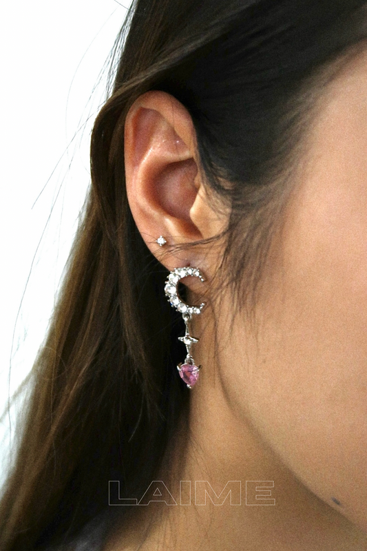 Pinky Diamond Star and Moon Asymmetrical Stud Earrings